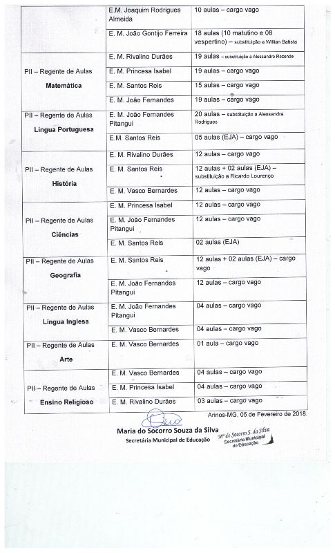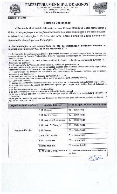 Edital de Designação nº 01/2018, para o ano letivo de 2018, objetivando a contratação de Professor dos Anos Iniciais e Finais do Ensino Fundamental, Servente Escolar e Supervisor Pedagógico.
