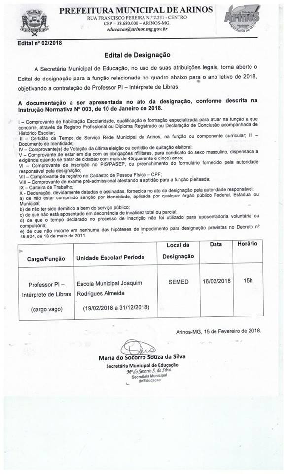 Edital nº 2/2018 Cargo: Professor PI - Intérprete de Libras