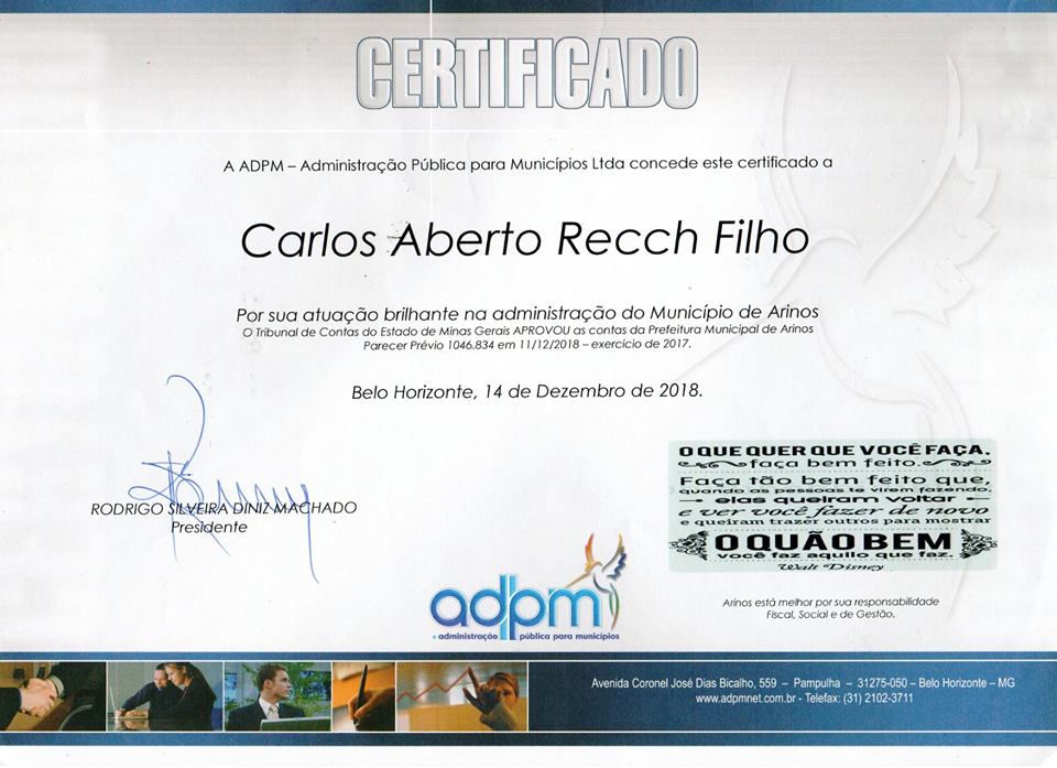 A ADPM - Administração Pública para o Município parabeniza o Prefeito Carlos Alberto Recch Filho, por sua brilhante atuação frente ao Poder Executivo Municipal de Arinos, em especial pela regularidade das contas da Prefeitura, conforme julgamento do Tribunal de Contas do Estado de Minas Gerais, referente ao exercício financeiro de 2017.