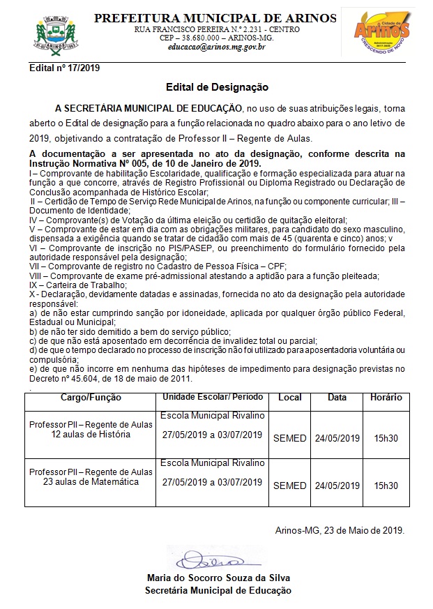Edital nº 17/2019 Cargo: Professor PII - Regente de Aulas