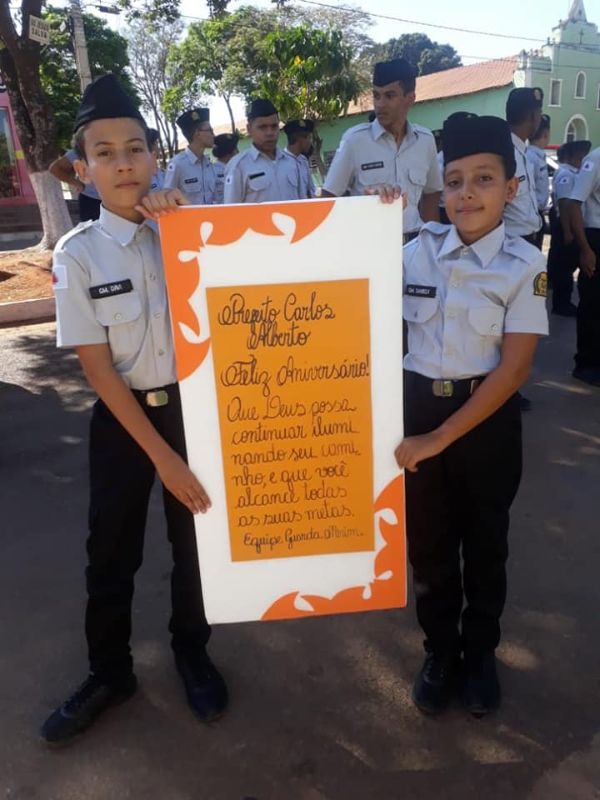 “Excelentíssimo Senhor Prefeito de Arinos, Carlos Alberto Recch Filho. Em nome da Guarda Mirim aproveitamos a oportunidade para parabenizá-lo por seu aniversário.Como forma de demonstrar o nosso carinho, prometemos cuidar de nossa querida Arinos e, com isso, transformá-la em um lugar melhor para se viver, promovendo junto à sua administração o desenvolvimento e prosperidade, através do trabalho e da união de todos para o bem comum. Rogamos a Deus para que lhe dê força e sabedoria para conduzir os destinos de nossa querida Arinos. Nossos agradecimentos, em nome da Guarda Mirim”.