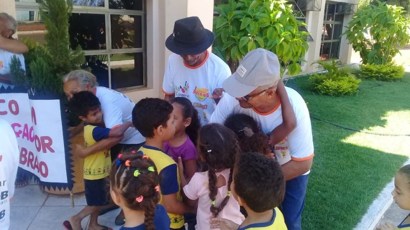 Grupo Idade de Ouro distribui abraços na sede da prefeitura.