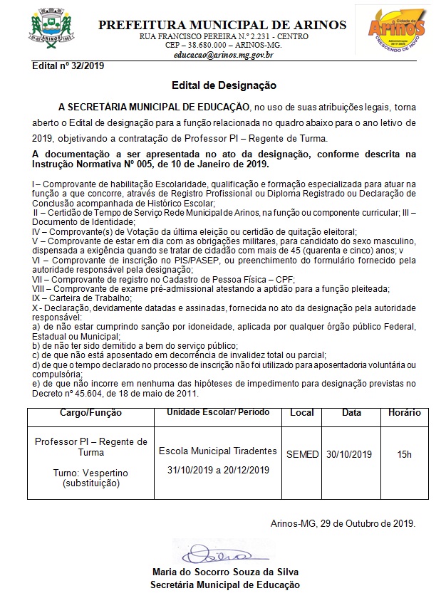 Edital nº 32/2019 Cargo: Professor PI - Regente de Turma