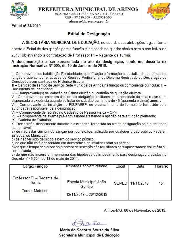 Edital nº 34/2019 Cargo: Professor PI - Regente de Turma