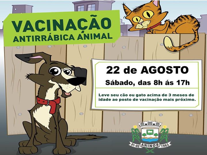 A Secretaria Municipal de Saúde, através do Setor de Vigilância Epidemiológica, informa aos munícipes de Arinos que a Campanha de vacinação contra a raiva animal em cães e gatos será realizada dia 22 de agosto (sábado) e levar o cartão de vacinação.Pelo bem humano e do seu bichinho de estimação, no dia já informado (22/08/2020), não se esqueça de levá-lo até um dos pontos de atendimento para receber a dose da vacina, que ao contrário do que algumas pessoas pensam, não traz dor, traz segurança.