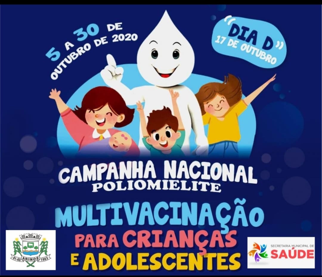 A Secretaria Municipal de Saúde informa que a vacinação contra a Poliomielite e a Campanha Nacional de Multivacinação para atualização da caderneta da criança e do adolescente encerra -se dia 30 de outubro. O "Dia D" da Multivacinação será no próximo sábado, dia 17 de outubro em todos os PSF's de 8h às 16h. Atenção: Não se esqueça de levar a caderneta de vacinação do seu filho, o cartão do SUS, além da máscara de proteção contra a Covid-19.