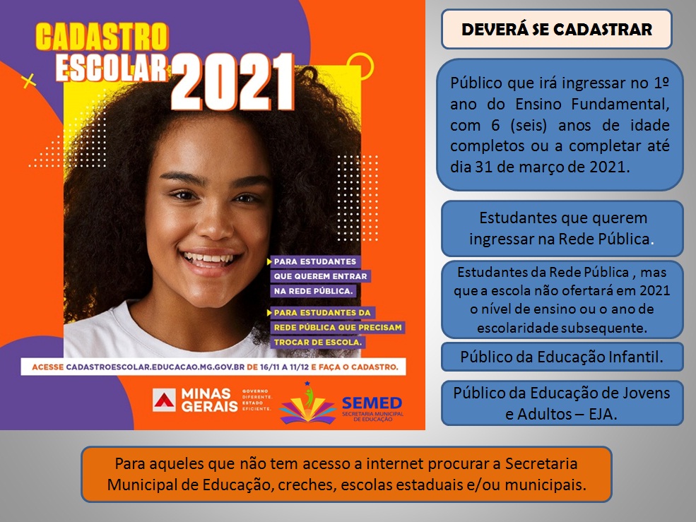 O Cadastramento Escolar 2021 vai até 11 de dezembro e deverá ser feito pela internet, no endereço eletrônico www.cadastroescolar.educacao.mg.gov.br