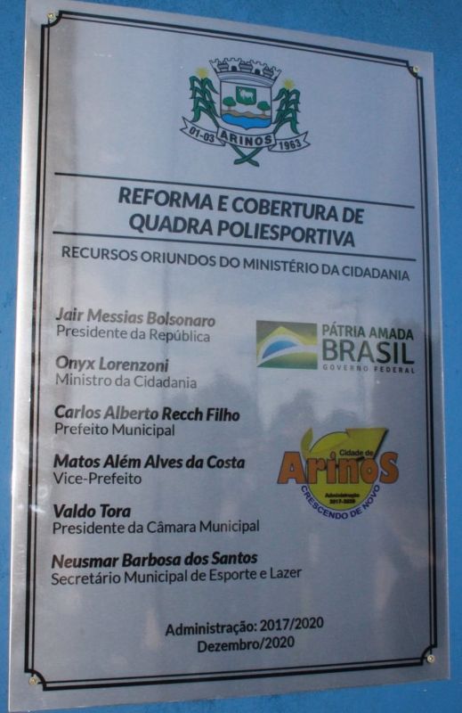 Essa obra é uma parceria da Prefeitura de Arinos, através do Ministério da Cidadania, por meio da emenda parlamentar do ex-Deputado Federal e Secretário-executivo do Ministério da Agricultura, Pecuária e Abastecimento, Dr. Marcos Montes e do vereador Cleuber Michirra.