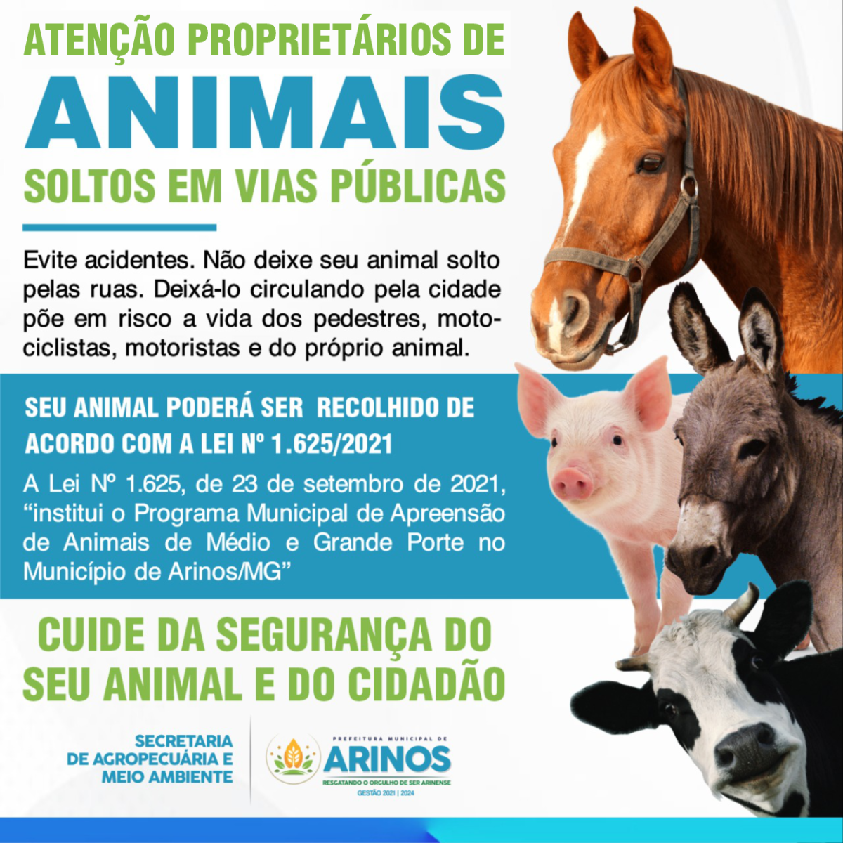 Atenção proprietários de animais soltos em vias públicas. Evite acidentes, não deixe o seu animal solto pelas ruas. Deixá-lo circulando pela cidade põe em risco a vida dos pedestres, motociclistas, motoristas e do próprio animal. E seu animal ainda poderá ser recolhido, de acordo com a Lei de número 1.625 de 23 de setembro de 2021, que institui o programa municipal de apreensão de animais de médio e grande porte no município de arinos.