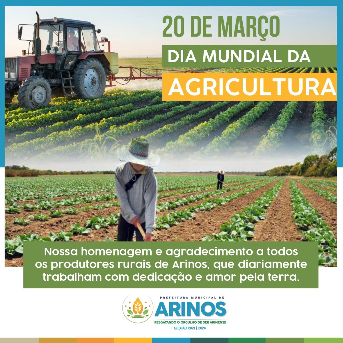 Publicado em 20/03/2023Hoje, 20 de março, é o Dia Mundial da Agricultura e a Prefeitura de Arinos não poderia deixar de reconhecer a importância desse setor para o nosso município. Estamos comprometidos em continuar apoiando e investindo na agricultura em nosso município, para que possamos continuar crescendo e fortalecendo esse setor tão importante para nossa cidade e para o país.