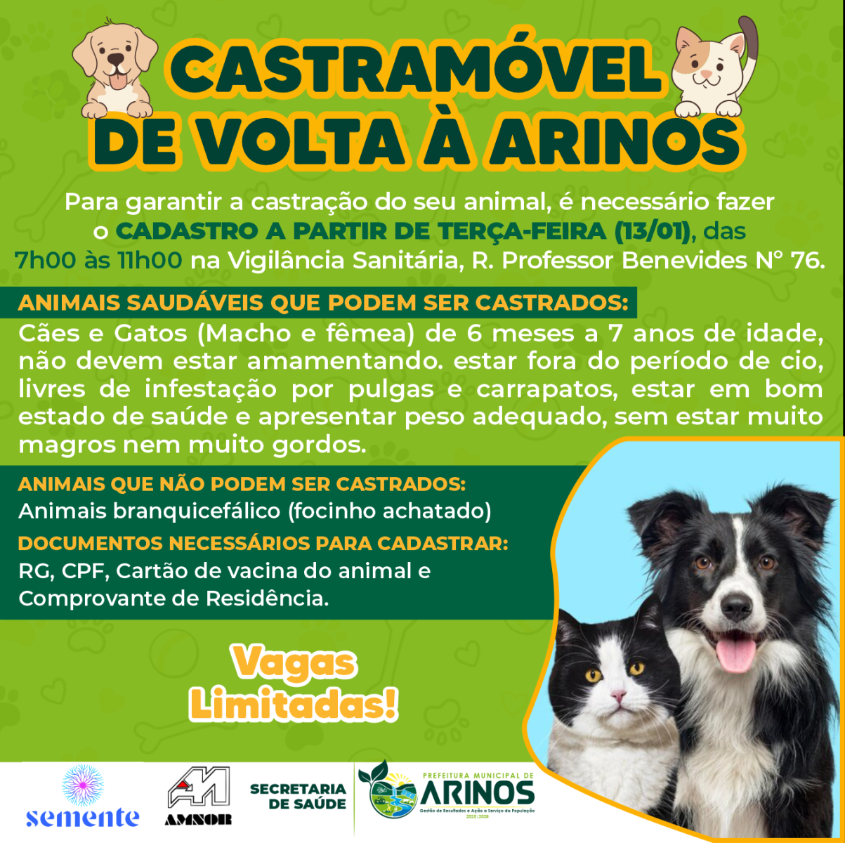 A Prefeitura de Arinos, por meio da Secretaria Municipal de Saúde, informa que o Castramóvel estará de volta ao município, oferecendo castração gratuita de cães e gatos.