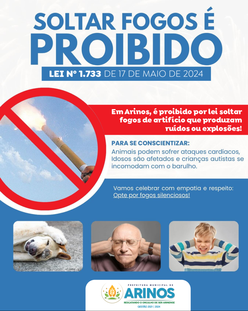 A Prefeitura de Arinos informa que, conforme a Lei nº 1.733, de 17 de maio de 2024, está proibido no município o uso de fogos de artifício que produzam ruídos ou explosões.